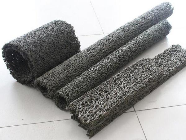 塑料盲溝是由塑料芯體外包裹濾布組式。塑料芯體是以熱可塑性合成樹脂為主要原料,經(jīng)過(guò)改性,在熱熔狀態(tài)下,通過(guò)噴咀擠壓出細(xì)的塑料絲條,再通過(guò)成型裝置將擠出的塑料絲在結(jié)點(diǎn)上熔接,形成三維立體網(wǎng)狀結(jié)構(gòu)。