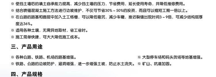 該產品適用于修建公路、鐵路以及江河湖海岸邊的加筋檔土墻、堤壩、橋面、陡坡及土工格室等工程。其作用是可提土墻或堤壩的承載力,延長使用壽命,減少占地面積,縮短工期,降低造價,減小維修費用。